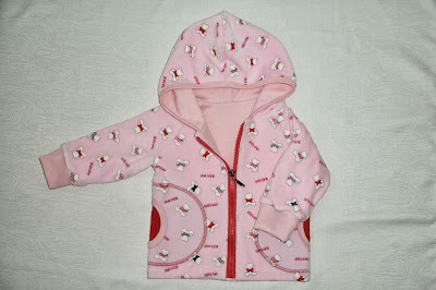 Лежал у меня кусочек розового велюра с лета, выудила из Галиных запасов. А две недели назад вдруг родилась идея костюма в сочетании с красным футером. Кофточку сделала с карманами и на подкладе из розового интерлока. Штанишки из футера свободного кроя, что не сковывает движения малышки.Манжеты как на кофточке так и на штанишках можно подворачивать.
